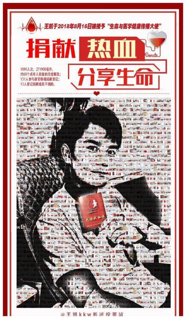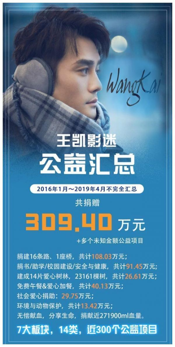 在王凯的感染和带动下,他的粉丝们同样热心参与到各种公益活动中,种树捐书、架桥修路、献血捐款、精准扶贫,其中,影迷朋友默默修完十多条山间公路的故事,曾被网友称为偶像和粉丝之间最浪漫的事。