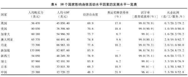身体活动受习惯性行为和社会认知等行为机制影响,早期简单习惯性动作有助于日后复杂性技能的形成,时间、金钱、他人合作等非激励性因素也。身体活动水平还受社会经济地位、体制特征、国家体育政策和文化程度等因素的制约。高收入、高经济自由度国家体育设施设备齐全,个体可支配时间和收入多,参与体育活动的可能性增加;奥运会成绩表现对身体活动参与率产生反效果,无法获得与精英运动员相同的场地或设施可能是抑制体育参与度的原因;高文化水平与健康认知水平相关,故增加了参与身体活动的可能性。查询国际货币基金组织、美国传统基金会、国际奥委会、世界数据网,搜集纳入国家2023年的人均购买力,2022年人均GDP、经济自由度、奥运会奖牌获得率(2020年东京奥运会)和居民识字率等指标的数据资料。见表6。