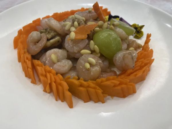 每支队伍都需要完成两道指定的“必做菜”和一道自选的“创意菜”。金红色的虾仁倒入锅中,伴随着核桃仁和松子一起上下翻飞。这道“核桃松子虾仁”对治疗肾亏耳鸣、腰酸腿软有不错的功效。来自凯泉泵业的参赛选手在每个试菜碟上摆好菜品,色香味十足。