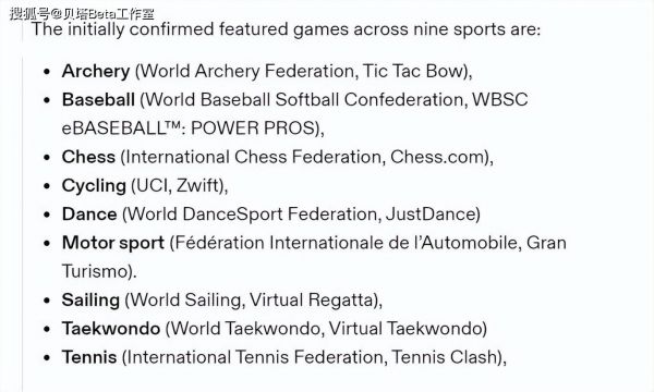 具体的9个项目如下,分别是射箭、棒球、国际象棋、自行车、舞蹈、赛车运动、帆船、跆拳道和网球。其中大家比较熟悉的游戏是,舞蹈赛道的《舞力全开》,以及赛车赛道的《GT赛车》。