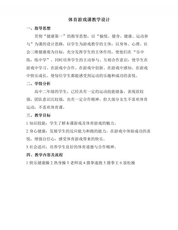 体育游戏课教学设计一、指导思想二、学情分析三、教学目标1.知识技能:学生了解本课游戏及体育游戏的魅力。2.身心健康:发展学生的反应能力和跑的能力,在游戏中体验成功的喜悦,增强自信心,感受体育游戏带来的快乐。3.社会适应:培养学生良好的体育道德与合作精神。四、教学内容及流程1.快乐健康操2.热身操3.老师说4.猜拳速跑5.猜拳王6.放松操体育游戏班级:高二(10)班人数:54人,男32人,女22人日期:2018年5月26日老师:李雄文教学目标1.知识技能:学生了解本课游戏及体育游戏的魅力。2.身心健康:发展学生的反应能力和跑的能力,在游戏中体验成功的喜悦,增强自信心,感受体育游戏带来的快乐。3.社会适应:培养学生良好的体育道德与合作精神。教学