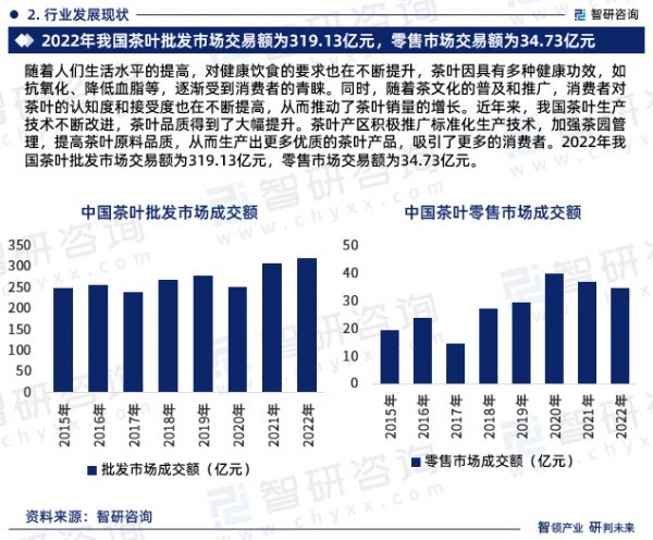 随着人们生活水平的提高,对健康饮食的要求也在不断提升,茶叶因具有多种健康功效,如抗氧化、降低血脂等,逐渐受到消费者的青睐。同时,随着茶文化的普及和推广,消费者对茶叶的认知度和接受度也在不断提高,从而推动了茶叶销量的增长。近年来,我国茶叶生产技术不断改进,茶叶品质得到了大幅提升。茶叶产区积极推广标准化生产技术,加强茶园管理,提高茶叶原料品质,从而生产出更多优质的茶叶产品,吸引了更多的消费者。2022年我国茶叶批发市场交易额为319.13亿元,零售市场交易额为34.73亿元。