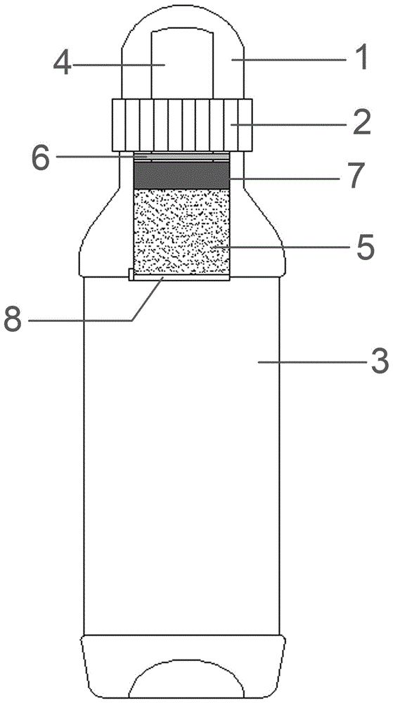 如图1-4所示的结构示意图,本实用新型所述的便携式饮用蜂蜜水瓶包括瓶盖和瓶体3,其中瓶盖包括盖体2和蜂蜜储藏罐部分,而蜂蜜储藏罐部分则包括按压杆4、蜂蜜储藏罐罐体5、活塞块7及底盖8。盖体2上方通过与保洁盖1通过卡扣式连接或者螺纹连接,盖体2的内螺纹与瓶体3上端端口的外螺纹通过相螺合来实现瓶体和瓶盖的连接。蜂蜜储藏罐罐体5呈圆筒形,其直径小于盖体2和瓶体3上端端口的直径;其上端具有3~6个等面积的长方形缺口并与盖体2一体式连接,可以方便打开保洁盖1后直接有水倒出;蜂蜜储藏罐罐体5底端通过卡扣连接方式连接有底盖8,所述底盖8上设有防止与罐体5底端断开的防断开结构。活塞块7上设有一个固定片6,固定片6中央位置具有一个表面积与按压杆4横截面积相等或稍大的空隙,按压杆4插入空隙与固定片6插入式连接后置于活塞块7上,可以通过按压杆4推动固定片6和活塞块7做向下运动,以此来推动蜂蜜储藏罐罐体5内蜂蜜的下落;固定片6和活塞块7密封安装在蜂蜜储藏罐罐体5内部,它们的直径与蜂蜜储藏罐罐体5的内径相等。活塞块7内部为天然橡胶材质,而其他部件均为塑料材质,这是为了保证天然蜂蜜的新鲜,所以采用橡胶材质的活塞块作为密封块,但是橡胶的材质较软,直接用按压杆不容易将蜂蜜推动,所以在活塞块上设有固定片便于按压杆将蜂蜜推动散入水中。