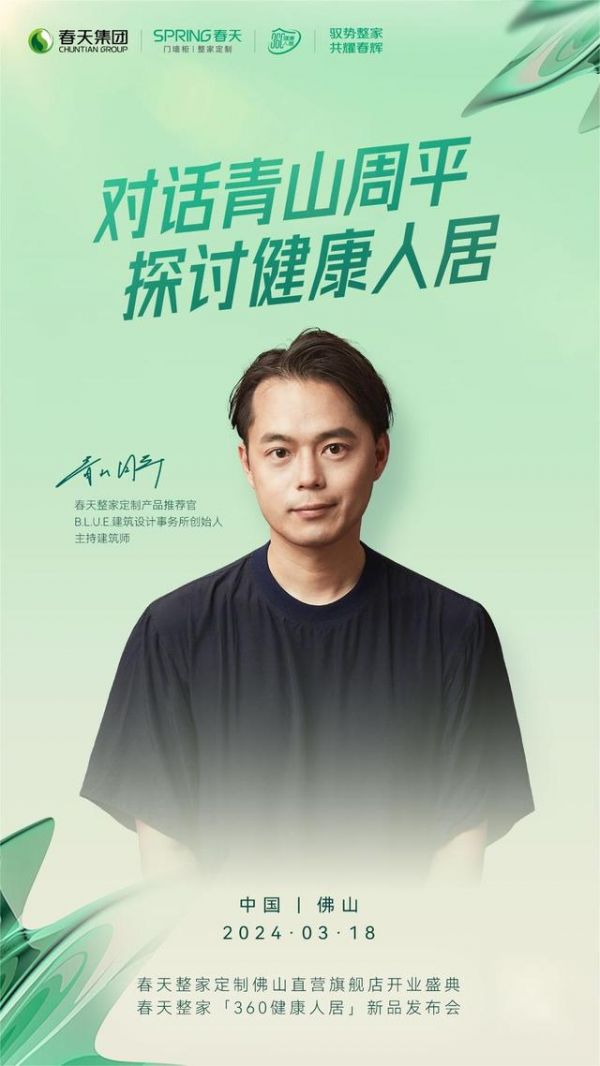 届时,“设计男神”建筑设计师「青山周平」将亲临现场,与我们共同见证春天新展厅、新产品的惊艳亮相。他将带领大家领悟春天整家定制健康人居产品的独特魅力,让大家走进一个全面升级的健康人居生活境界。