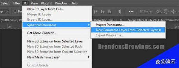 要在 Photoshop 中将图像转换为 360° 全景图,请选择图像图层并在顶部的 3D 菜单下找到“球形全景图”。选择“从选定图层新建全景图层”。