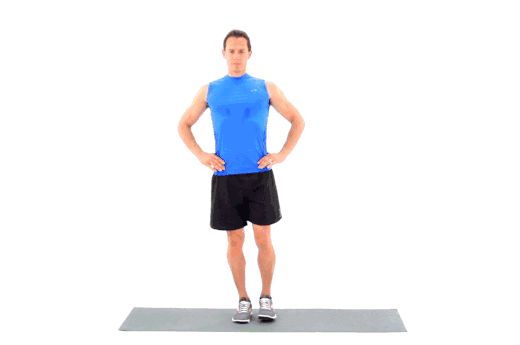 双臂弯曲,双手叉腰,腰背平直,腹部绷紧,抬头挺胸,眼看前方。一条腿伸直,整个脚掌贴地支撑身体,另一条腿弯曲膝盖,脚掌轻微抬离地面,不与地面相接触。俯下身体,臀部向后移动,进行下蹲。下蹲到最大程度以后缓慢起身,还原姿势,动作进行,抬起腿始终不与地面有交点。