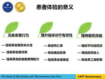 毫无疑问,提高患者体验并非只有患者才是赢家,而医院只是一味付出。其实,医院会从中获得显见的效益,简单归纳就是:患者有好的体验,就会更加信任和配合医生,就医依从性自然提高,临床疗效随之提升,进而缩短平均住院日、增加医院收入,等等。