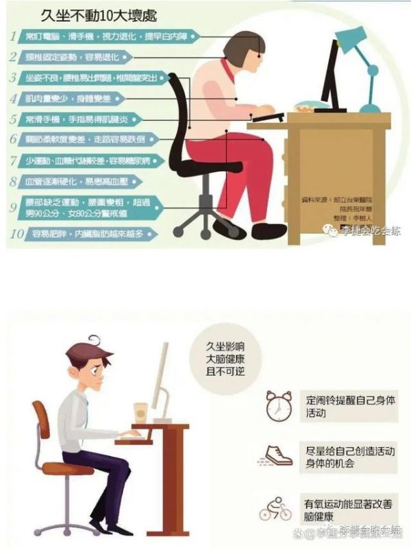 而且既便你当天有过自主的运动,比如说你晨跑了半小时,但是上班的时候依旧是久坐不动。那么,运动带给你健康的益处也会被久坐不动造成的风险抵消了一部分。所以即便你运动了,也不能久坐不动,需要经常起来活动一下,哪怕只是两三分钟也有效果。