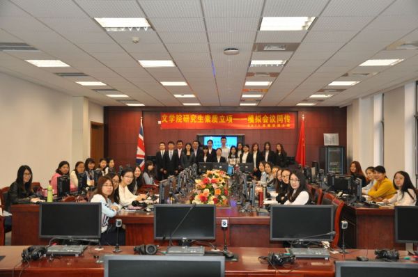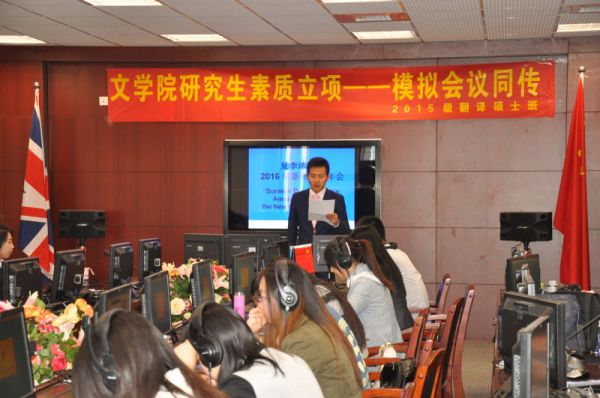 4月22日上午9点,天津大学外国语言与文学学院2015级翻译硕士班在33教学楼同声传译实验室开展研究生素质立项系列活动模拟会议同传。