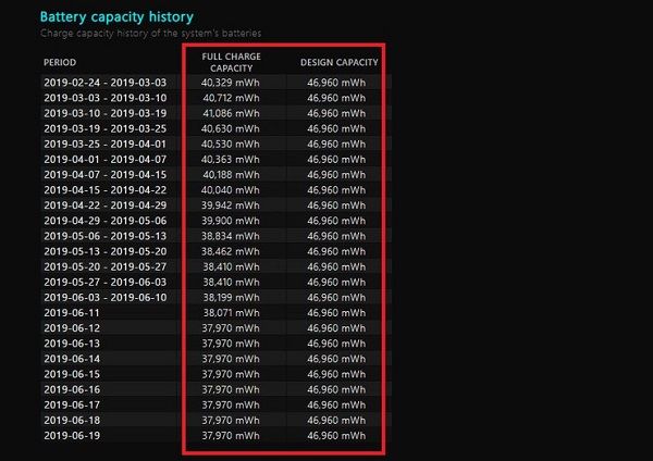 电池容量历史记录部分显示容量随时间的变化情况。 右侧是设计容量,或电池设计要处理的程度。 在左侧,您可以看到笔记本电脑电池的当前完全充电容量,随着时间的推移,您使用设备的次数可能会下降。