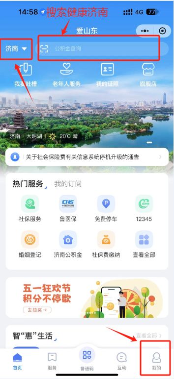 第二步:左上角位置定位改为“济南”,点击右下角“我的”登录、注册(填写个人信息),返回主页搜索栏搜索“健康济南”