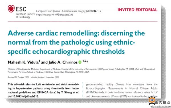 [本站讯]10月29日,山东大学齐鲁医院心血管内科张运院士和张梅教授团队在《欧洲心脏杂志-心血管影像》(European Heart Journal - Cardiovascular Imaging,中科院一区,5年IF 7.984)在线发表“Left ventricular and atrial remodelling in hypertensive patients using thresholds from international guidelines and EMINCA data”的研究论文以来,在国际上引起了强烈反响。11月18日,该杂志在线发表了美国宾夕法尼亚大学Vidula MK和Chirinos JA两位教授撰写的编辑部评论:“心脏不良重构:应用种族特异性超声心动图阈值区分正常与患病”(European Heart Journal - Cardiovascular Imaging,2021, doi: 10.1093/ehjci/jeab246),对张运院士团队研究给予了高度评价并指出了今后的研究方向。