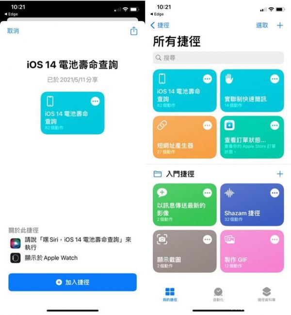 STEP 1:开启iOS 14电池寿命查询捷径,点选「加入捷径」安装,如果显示无法打开捷径的错误讯息,请参考「iOS、iPadOS无法打开此捷径?开启这项设定允许执行不受信任的捷径来源」先进行设定。