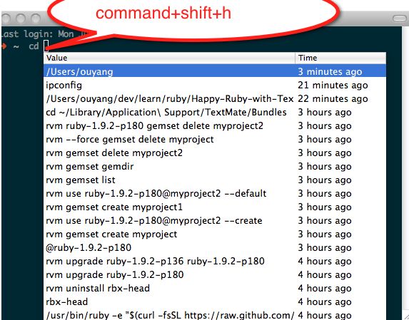 输入开头命令后 按 ⌘ + ; 会自动列出输入过的命令