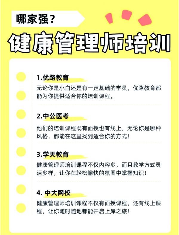 想要成为健康管理师?选择一个靠谱的培训机构至关重要。经过市场调研,我们整理了以下几家备受好评的健康管理师培训机构,供你参考: