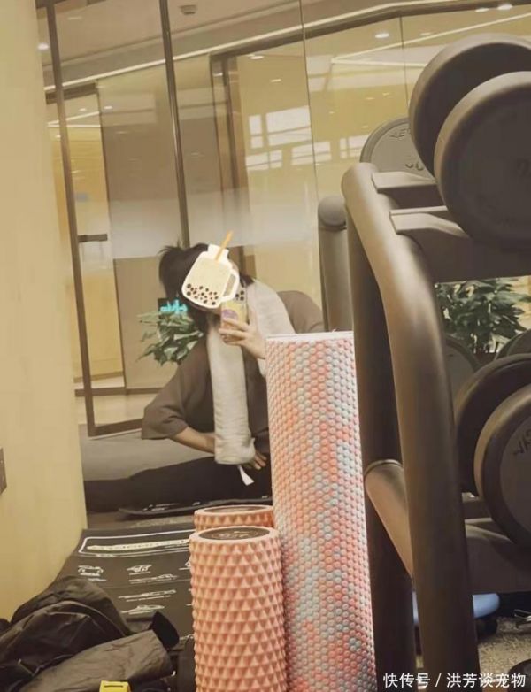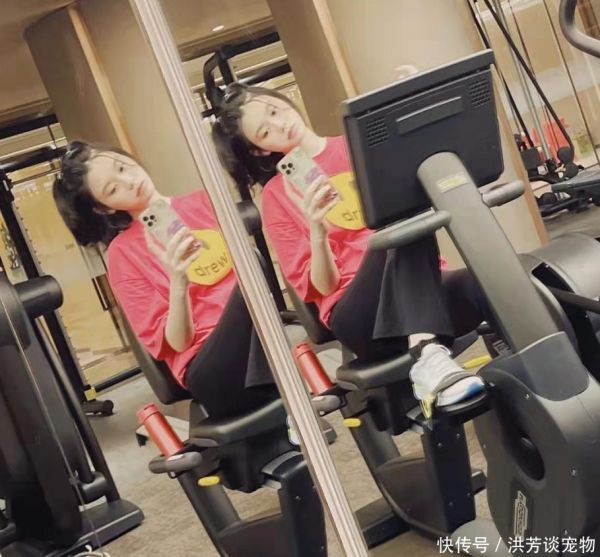 锻炼的同时,奚梦瑶也不忘自拍。她穿着水红色宽松T恤,头上扎着两个小辫,歪着头对镜自拍,看起来非常萌。
