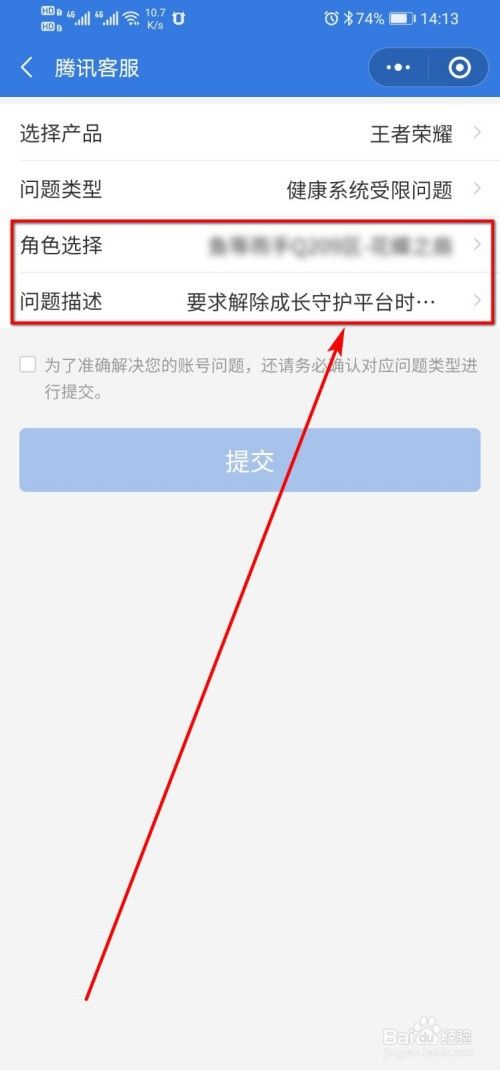 4、角色选择游戏账号的大区;问题描述填选“要求解除成长守护平台时间限制”