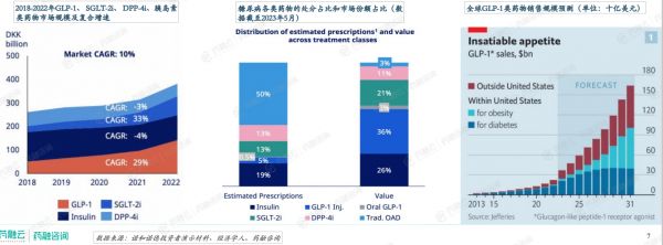 截至2023年5月,尽管GLP-1类药物处方量渗透率仅5.5%(注射剂5%、口服0.5%),但糖尿病药物市占率已达39%(注射剂36%、口服3% ),超过胰岛素成为全球第一大糖尿病治疗药物类型。