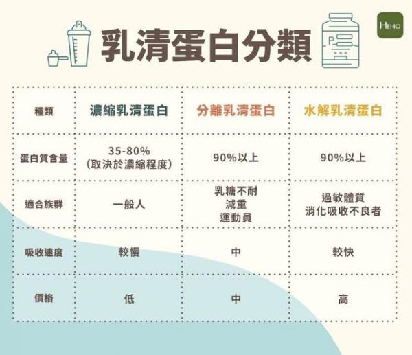 「浓缩乳清蛋白」适合大部分的人;对乳糖不耐者可以选择乳糖含量少的「分离乳清蛋白」;肠胃吸收状况差、较敏感等特殊族群,就可以选择「水解乳清蛋白」,建议依照自己的需求选择适合的产品。