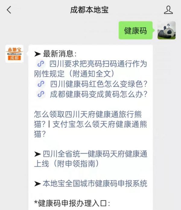 温馨提示:微信搜索并关注公众号成都本地宝,在聊天对话框回复【健康码】即可直达四川天府健康通和全国防疫信息码申领入口!