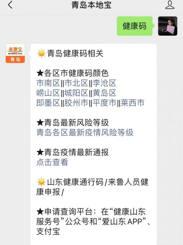温馨提示:微信搜索公众号【青岛本地宝】,关注后在对话框回复【健康码】可获青岛赋码转码管理通知,山东健康码代扫登记功能使用,申领|来鲁申报入口,申领操作指引等
