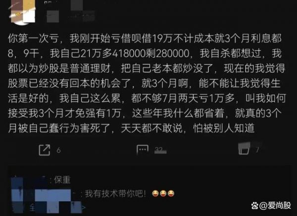 除自己投资亏损外,在股吧中也看到许多人和我遭遇相似的困境。一位股民表示,他的41万缩水至28万,甚至萌生了绝望的念头,原本认为炒股仅是一种普通的理财方式,未料几乎损失了所有积蓄。