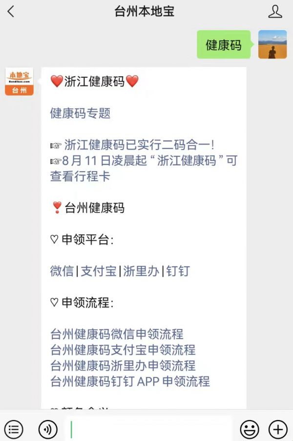 温馨提示:微信搜索公众号台州本地宝,关注后在对话框回复【健康码】,可获台州健康码最新消息、申领入口及操作指南等