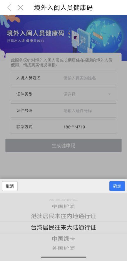 用户登录闽政通APP,进入“境外入闽人员健康码”服务,按照要求填报姓名、证件类型、证件号码和联系方式等个人信息。其中,证件类型包括:居民身份证、中国护照、台湾居民来往大陆通行证、港澳居民来往内地通行证、中国绿卡、外国护照等。该服务面向近期从境外入闽人员或长期居住福建的港澳台同胞,暂不支持为家人申领。