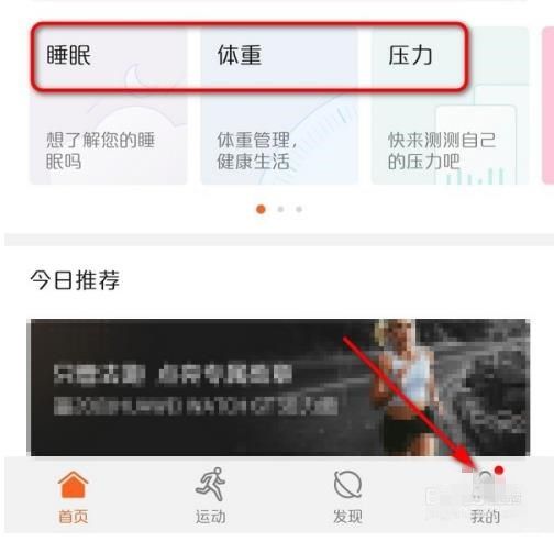 3、进入APP主界面,睡眠、体重、压力,可以做一个测试,记录一下未使用运行健康前的状态,之后点击页面右下角的我的图标