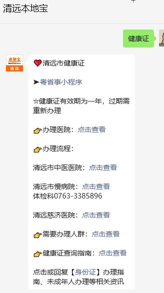 温馨提示:微信搜索公众号【清远本地宝】关注后回复【健康证】可获得清远健康证办理医院、办理流程、携带材料、健康证查询等信息。
