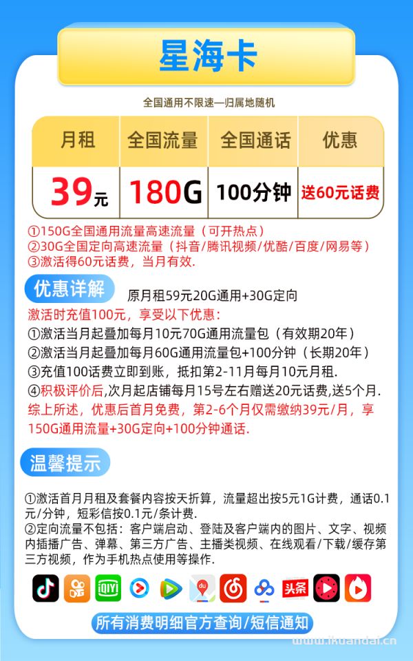 5、5G电信星海流量卡(39元月租包150GB通用流量+30GB定向流量+100分钟通话,首月送60元体验金。)