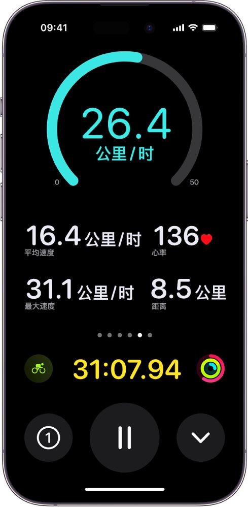 当你开始单车训练时,该训练会作为实时活动自动显示在 iPhone 上。轻点该训练以使其占据整个屏幕,从而更容易在骑车时看到自己的指标。