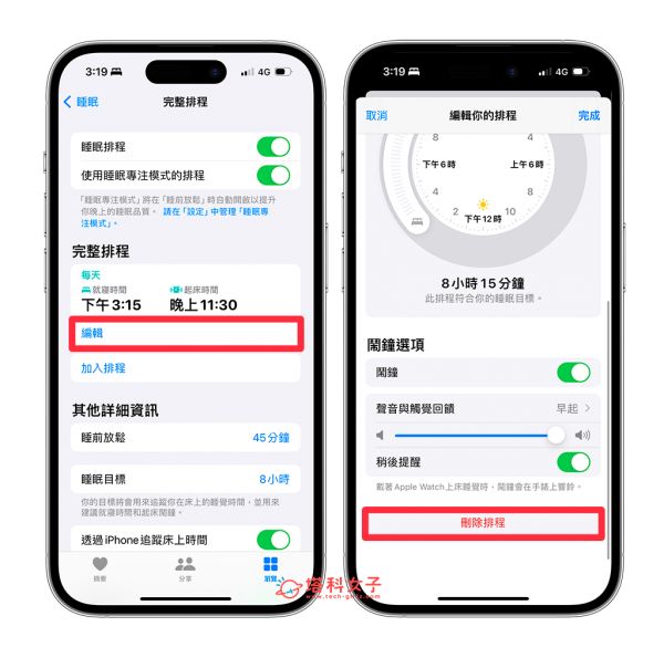 这边你会看到自己设置的「就寝时间」和「起床时间」等数据,请点击「编辑」。 除了可以自由编辑就寝时间和起床时间外,想删除设置的话请滑到下方点选删除排程,这样就成功将iPhone就寝时间删除了。
