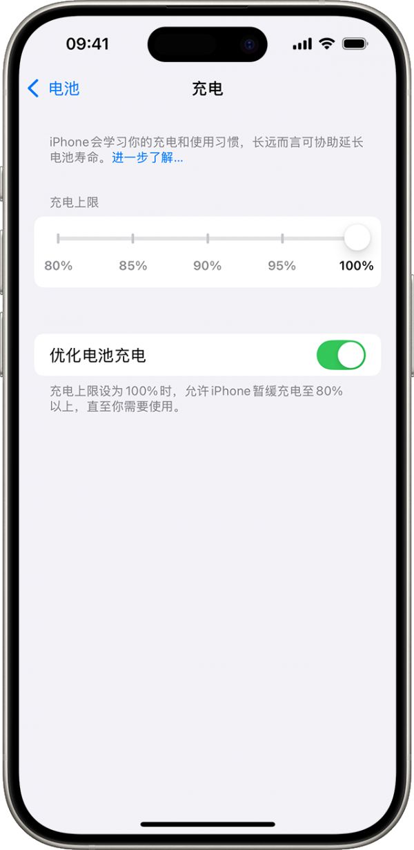 在 iPhone 15 各款机型及更新机型上,如果充电上限为 100%,那么你还可以打开“优化电池充电”。这些是 iPhone 的默认设置。