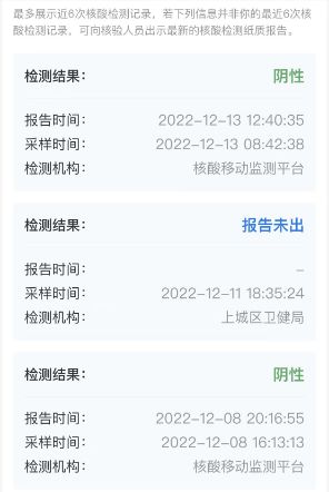 刘女士12月11日傍晚18点35分在上城区普福家园门口小公园点位做的核酸,结果一直未出。足足等了一天,还没有等到阴性结果的她有点害怕,赶紧又去做了一次核酸检测。12月13日上午8点多检测,近1点出了结果,显示阴性。