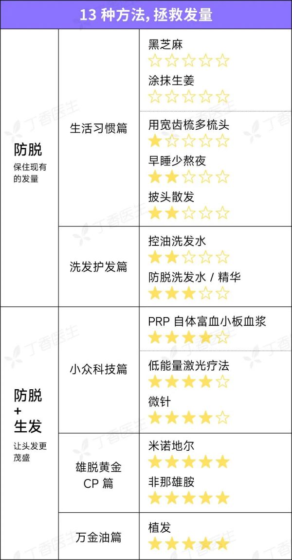 以上这些拯救发量的方法, 我们还邀请了皮肤科医生,参考脱发指南进行打分,其中星星越多越推荐。需要的朋友可以直接保存,方便随时查看。