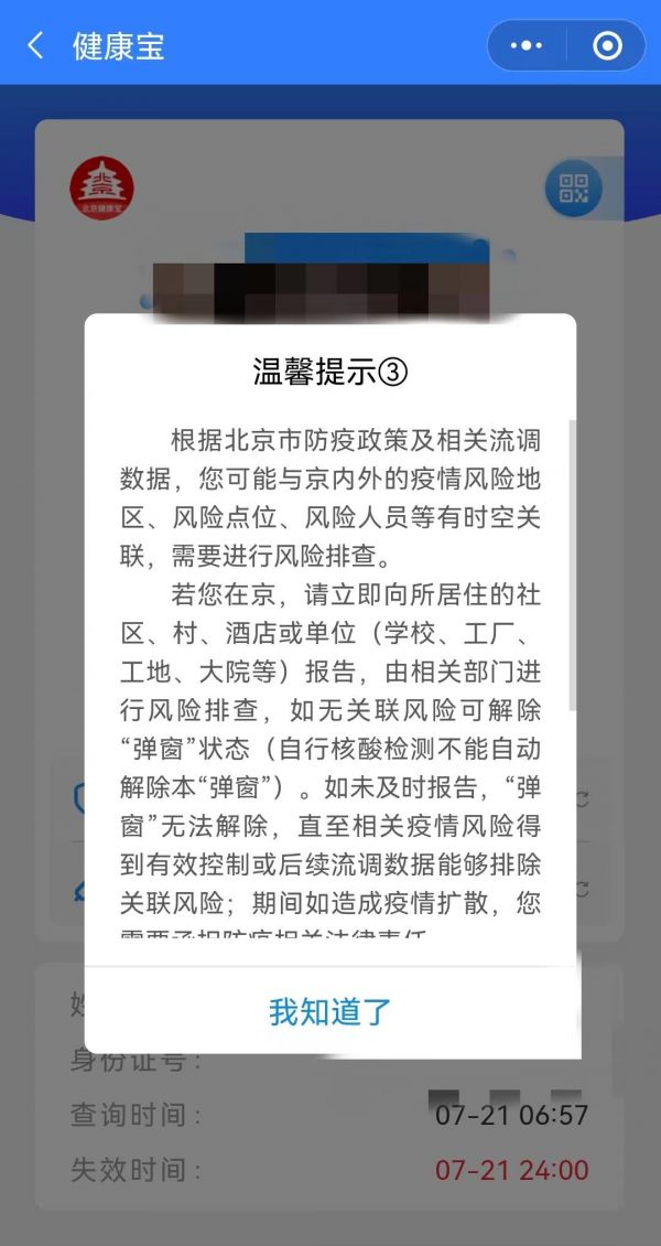 提醒市民朋友:北京“健康宝”弹窗提示风险人员及时进行核酸检测