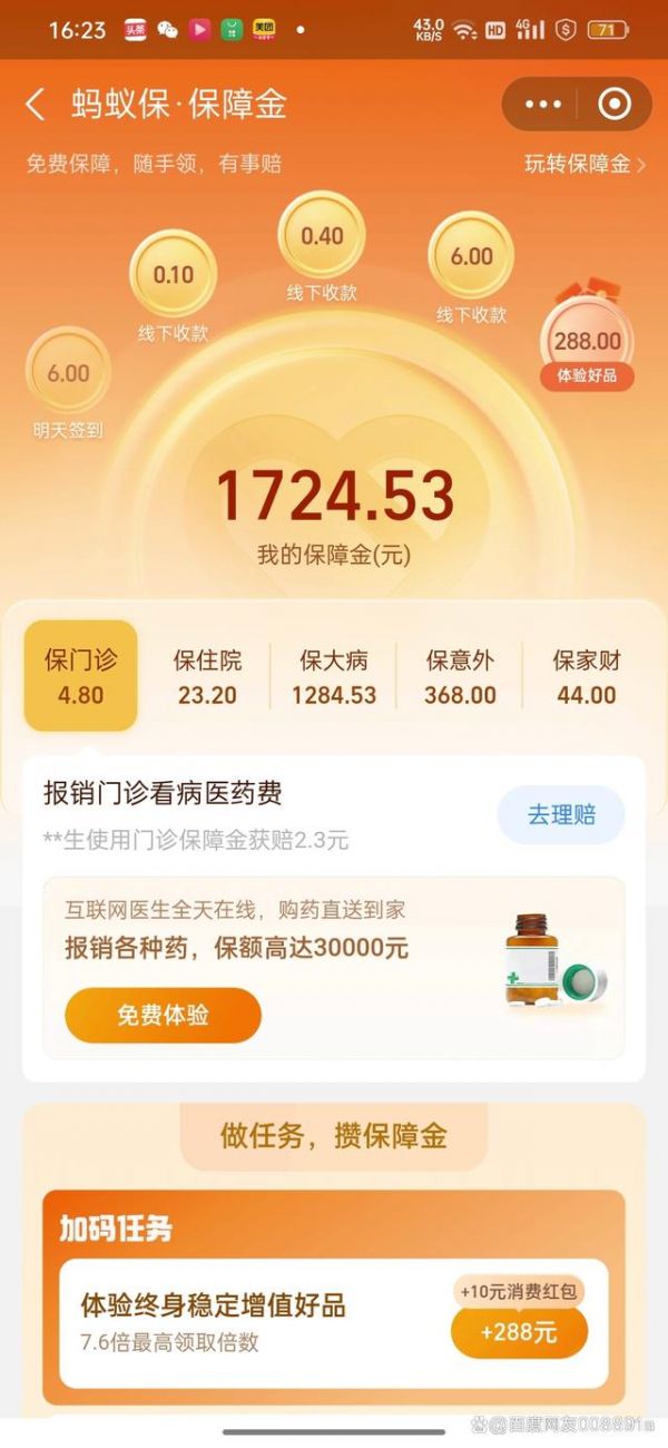 平时我们都知道我们支付宝付款.收钱.转账。很少有人知道支付宝还有一种可以免费领取的健康金!这是支付宝为我们用户免费赠送的健康保障福利,领取以后,可以用于因疾病意外造成的门诊.住院.大病保障金的报销额度。几年前本人因意外脚步骨折,还报销过,虽然额度不多,小钱也是钱啊!而且现在还赠加了一项保家财!
