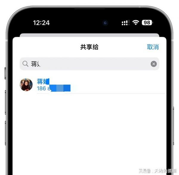 4、这里要注意了,选择的共享人必须是自己的联系人,输入保存的联系人姓名,然后在搜索结果里选择他。