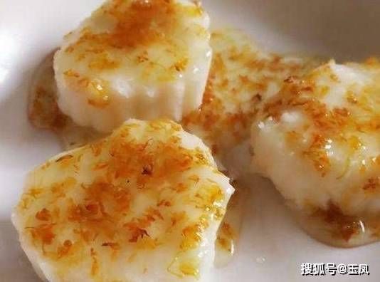 3、糖煮溶化后放糖桂花,用水淀粉勾稀芡,放入熟猪油,起锅,浇在山药糕上即可。