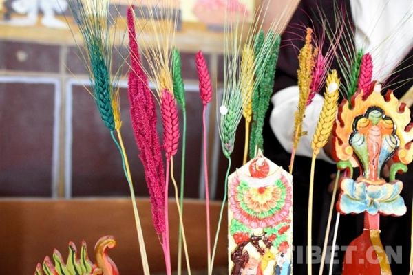 图为青稞麦穗染色做成的“罗萨梅朵” 摄影:拉姆