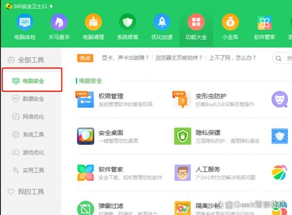 2、点开【功能大全】之后,在左边选项找到【电脑安全】,会出现一些360安全卫士自带的工具。