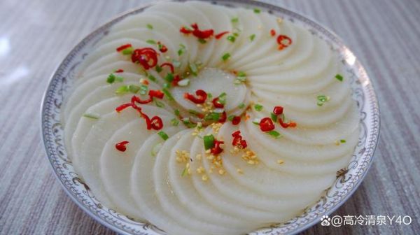 5、将调好的调料汁浇在萝卜片上,撒上香葱碎,上桌。