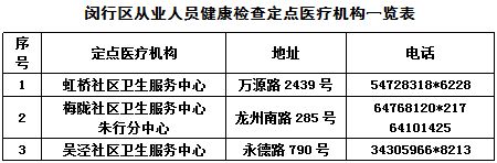 根据《关于印发<上海市从业人员健康检查管理办理(试行)>的通知》(沪卫计规[2018]4号)及《关于指定虹桥社区卫生服务中心等3家医疗机构作为闵行区从业人员健康检查定点医疗机构的通知》(闵卫计疾控[2018]20号)文件规定,闵行区“定点医疗机构”(免费体检)为三家:虹桥社区卫生服务中心、梅陇社区卫生服务中心、吴泾社区卫生务服中心。有效期自2018年5月1日至2020年4月30日。