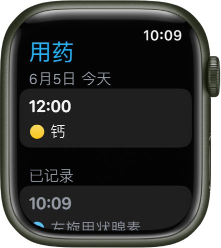 “用药” App 帮助你跟踪用药、维生素和膳食补充品。只需在 iPhone 上将用药添加到“健康” App 中并使用 Apple Watch 进行记录即可。
