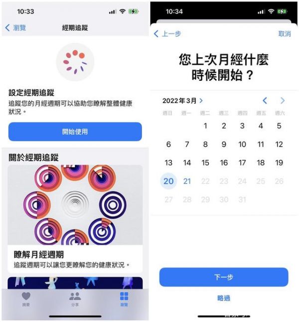 而要如何使用iPhone监测经期状况呢?首先打开“健康App”,找到浏览中的经期追踪选项,点选开始使用,输入上次经期状况、持续时间、周期等数据,就可以开始记录。