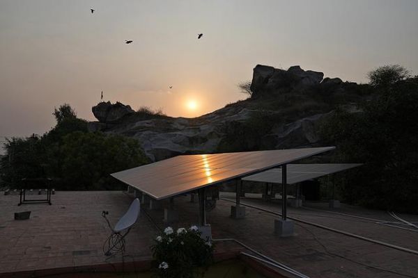 印度雷丘尔,夕阳下的鸟儿飞过一家政府妇产医院屋顶上的太阳能电池板。
