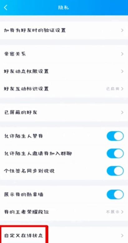 3可看见“隐私”一项,点击“隐私”,可以在下方看见“自定义在线状态”,点击“自定义在线状态”。