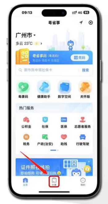 1、打开“粤省事”小程序首页,点击下方导航菜单“办事”。