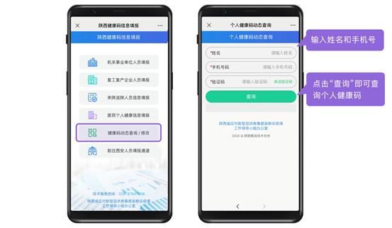 1. 关注“健康陕西公众服务”微信公众号,进入公众号点击“健康码”选择“我的健康码”,输入姓名、手机号码和验证码后,点击查询即可获取到已申领的个人健康码。